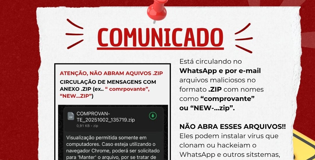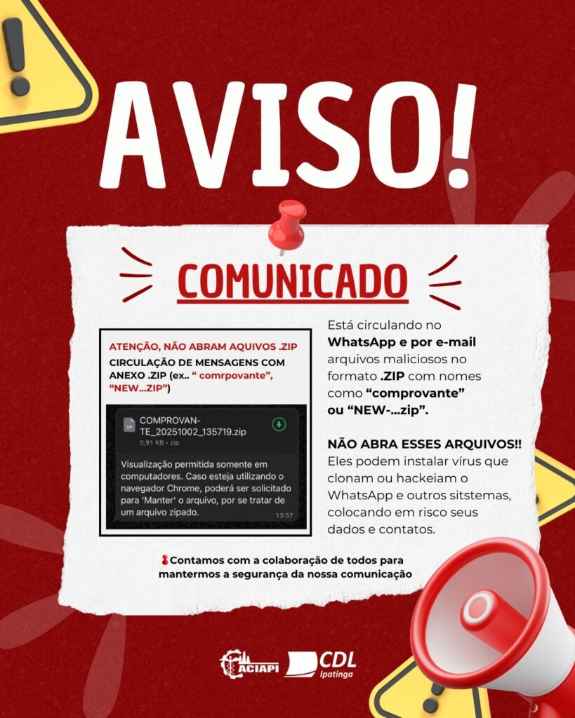 A ACIAPI-CDL de Ipatinga reforçam que os associados e toda a comunidade empresarial de Ipatinga devem redobrar a atenção. Não abra arquivos compactados enviados por números desconhecidos. Antes de qualquer clique, confirme a origem da mensagem. A prevenção é a melhor forma de evitar prejuízos e proteger dados pessoais e corporativos.